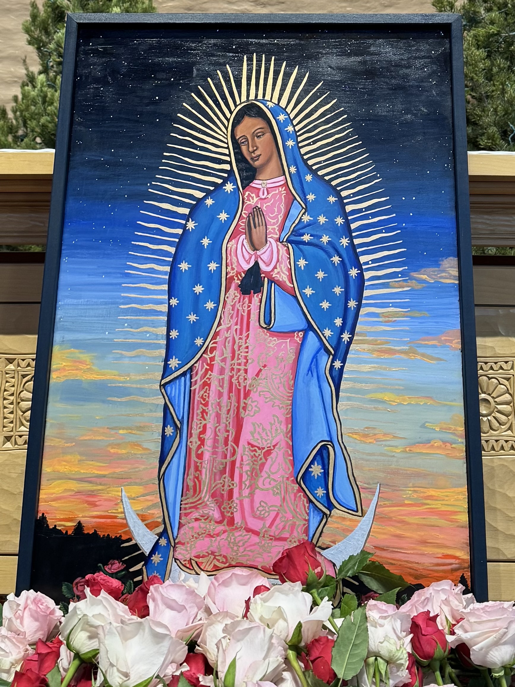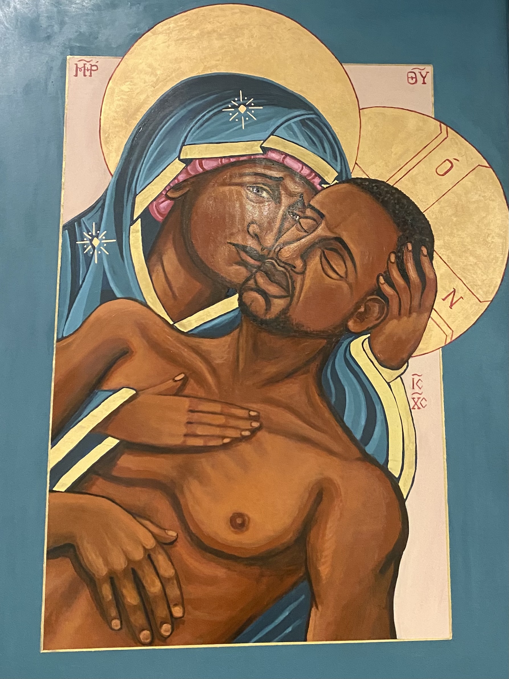 The icon of Our Lady of Guadalupe you see before you was written by an iconographer named Kelly Latimore. At my previous church we had another icon of Kelly’s, which he named “Mama.” There’s a copy hanging right now on the wall of the pavilion. You can visit after the service. “Mama” is a pieta, an image of Mary holding the body of Jesus. Kelly wrote Mama after the death of George Floyd. “Mama” was Floyd’s last word.
