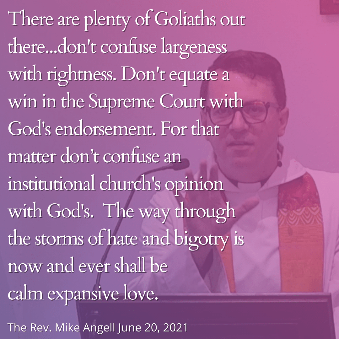 There are plenty of Goliaths out there. There are plenty of shiny, slick, powerful forces, and the world is very impressed. But don’t confuse largeness with rightness. Don’t equate a win in the Supreme Court with God’s endorsement. For that matter don’t confuse an institutional church’s opinion with God’s. God doesn’t see as humans see. The way through the storms of hate and bigotry is now and ever shall be calm expansive love.